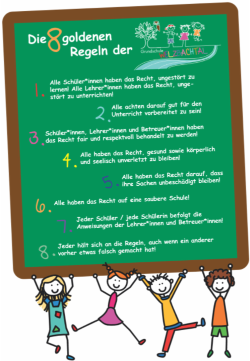 Im Folgenden stellen wir Ihnen „Die 8 goldenen Regeln der Grundschule Welzbachtal“ vor, die mit allen Kindern zu Beginn des Schuljahres besprochen werden.
